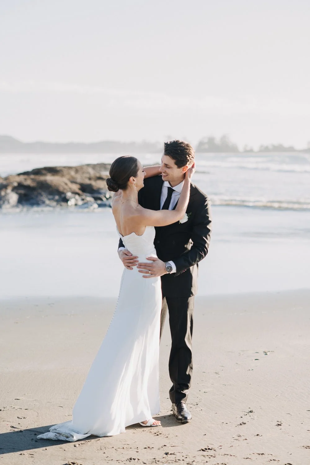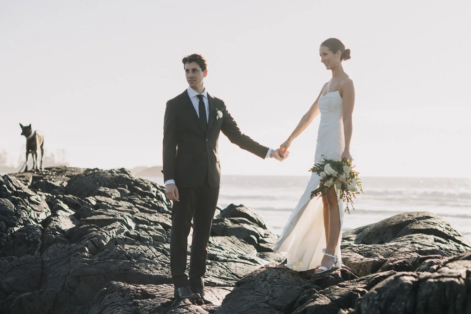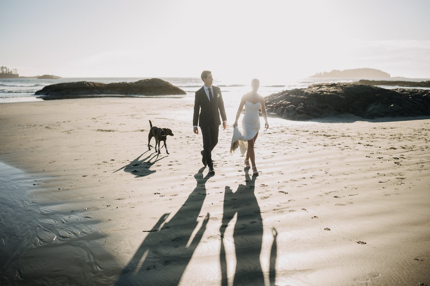 Getting married in November is definealty a gamble as far as weather is concerned. Somedays it’s raining sideways and blowing a gale other days it’s calm, sunny and beautiful, both are beautiful in their own way. For Andrea and Brendan’s intimate elopement at the Wickaninnish Inn they got the latter of the two. Not a breath of wind and the nicest low winter light. These two were so effortlessly glamorous and I had such a fun time frolicing on the beach with them and their adorable pup.